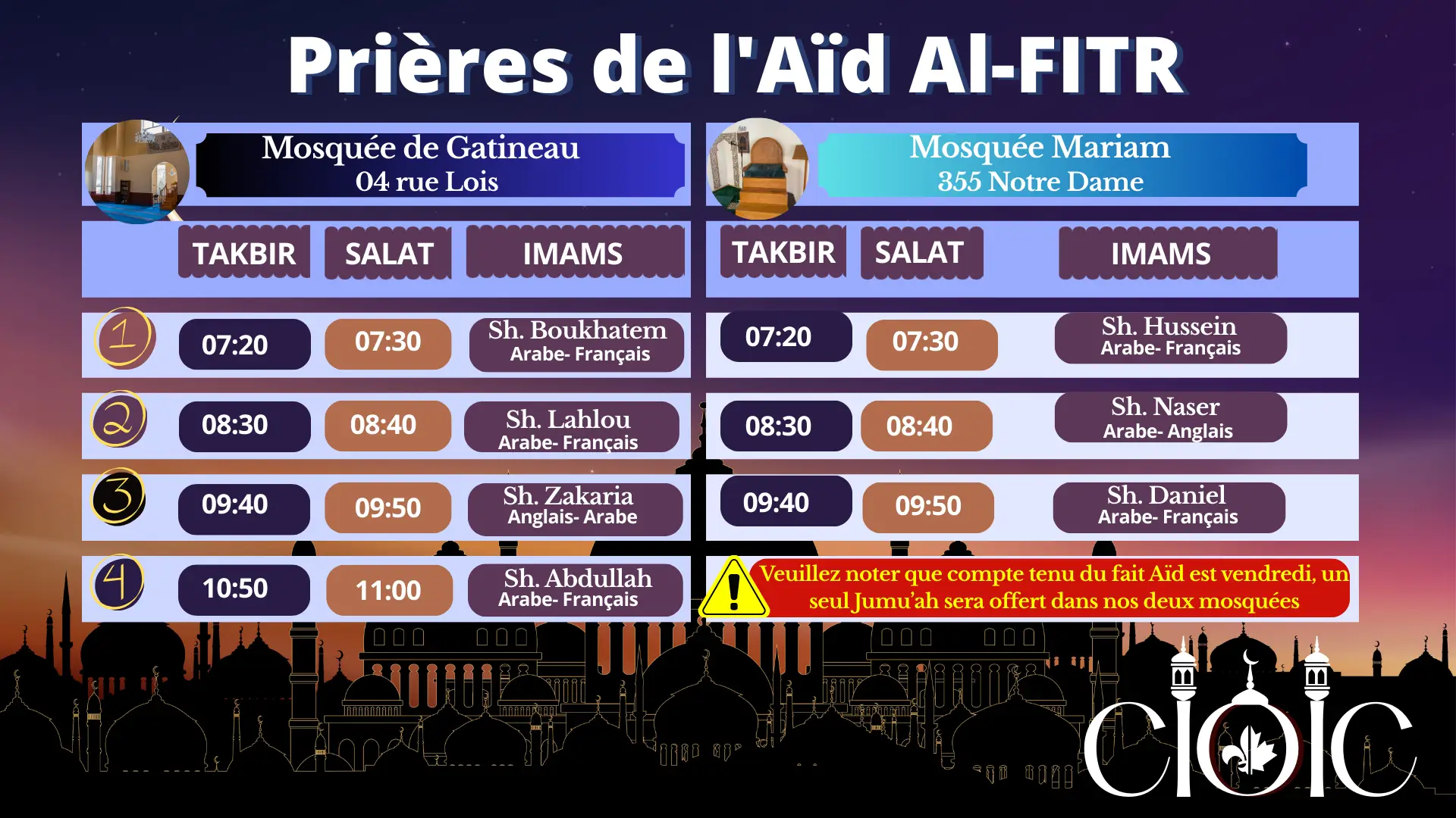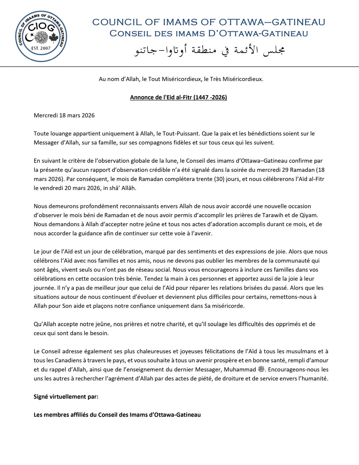 Le Conseil des Imams d’Ottawa-Gatineau a le plaisir d’annoncer que l’Aïd al-Fitr sera célébré le vendredi 20 mars 2026, in shâ’ Allâh. Qu’Allah accepte nos jeûnes, nos prières et nos bonnes actions.